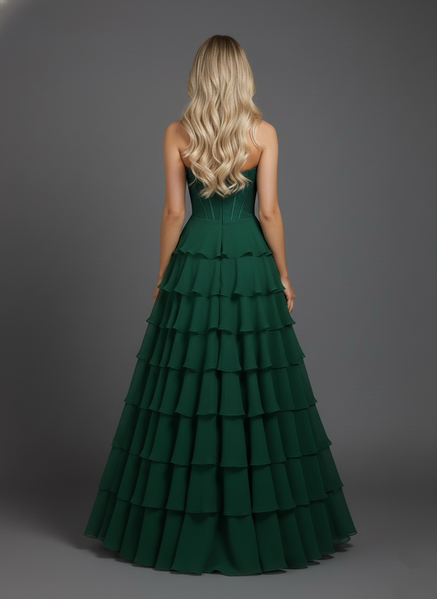 Deslumbra com este sofisticado vestido em verde garrafa, pensado para ocasiões especiais onde a elegância é protagonista. O modelo apresenta um corpete estruturado com detalhe em renda delicada no decote coração, valorizando a silhueta com um ajuste perfeito e feminino.