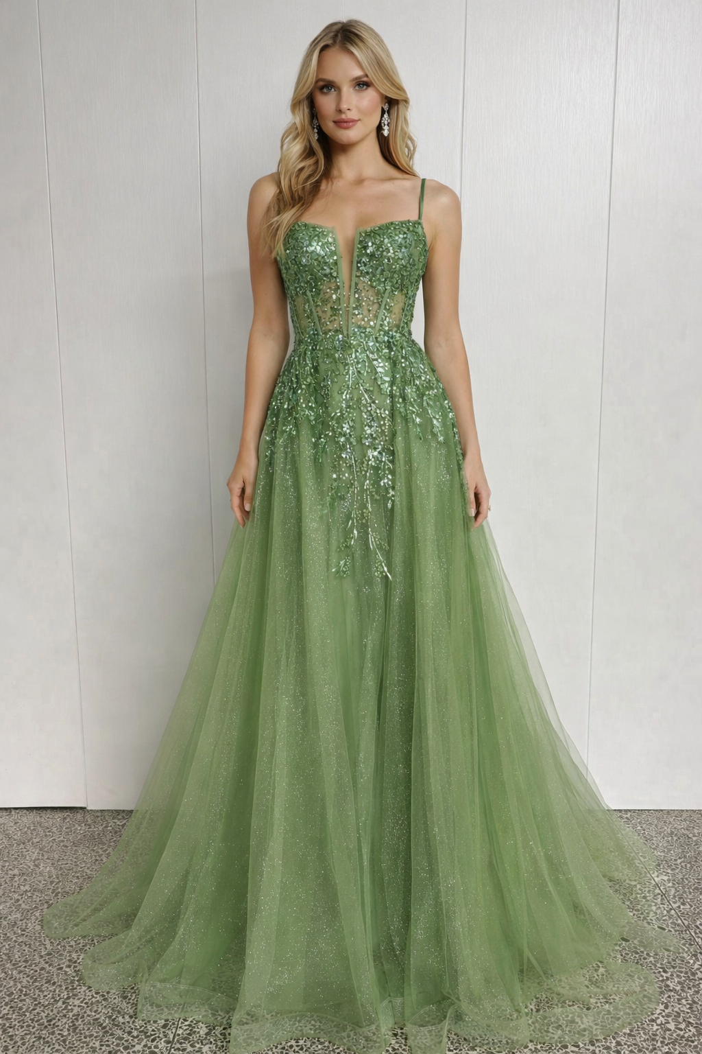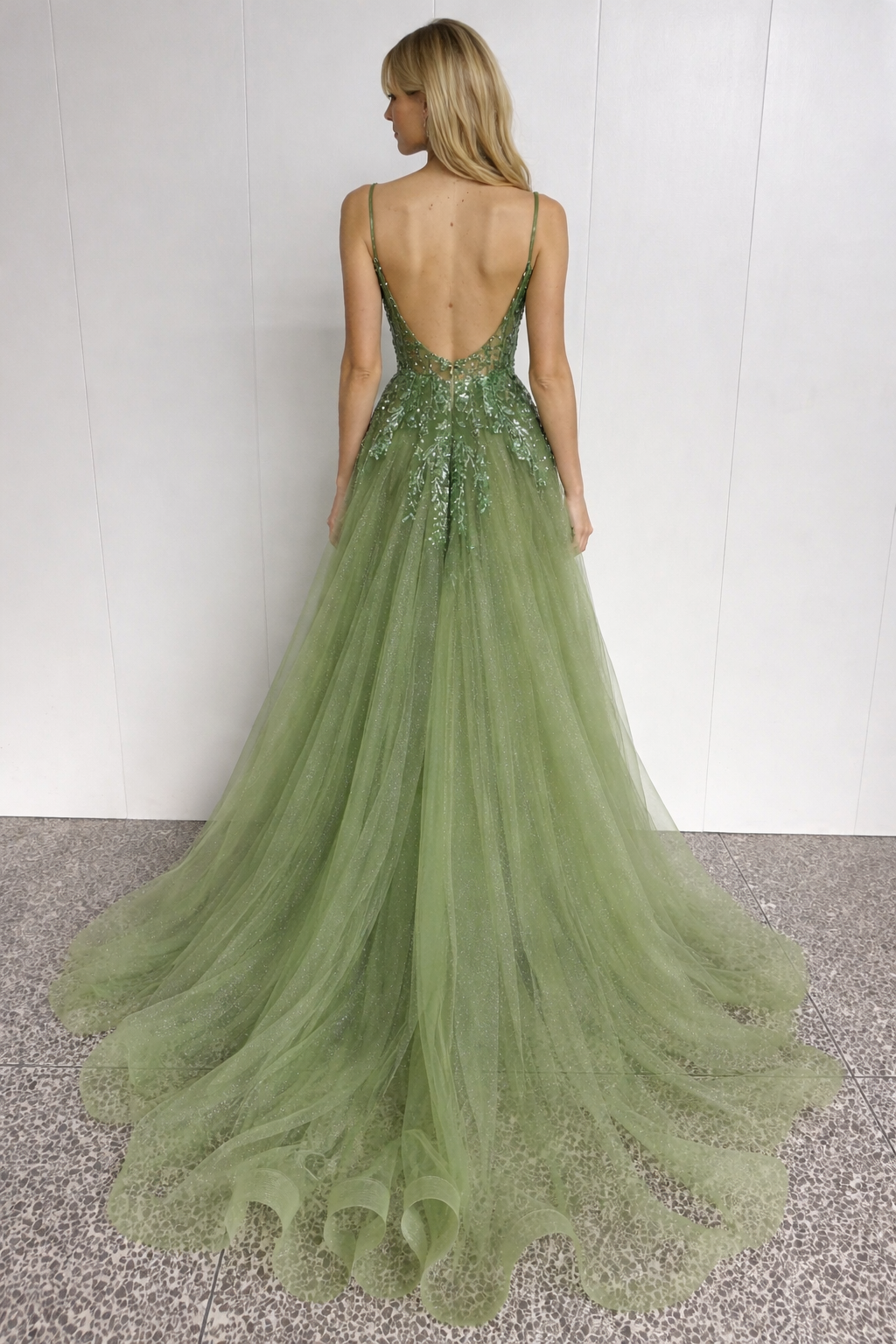 Este deslumbrante vestido de gala em tom verde oliva combina sofisticação e leveza numa silhueta intemporal. Confeccionado em delicadas camadas de tule com acabamento subtilmente brilhante, o modelo apresenta um corpo estruturado ricamente adornado com aplicações de pedraria e lantejoulas, que conferem luminosidade e requinte ao visual.