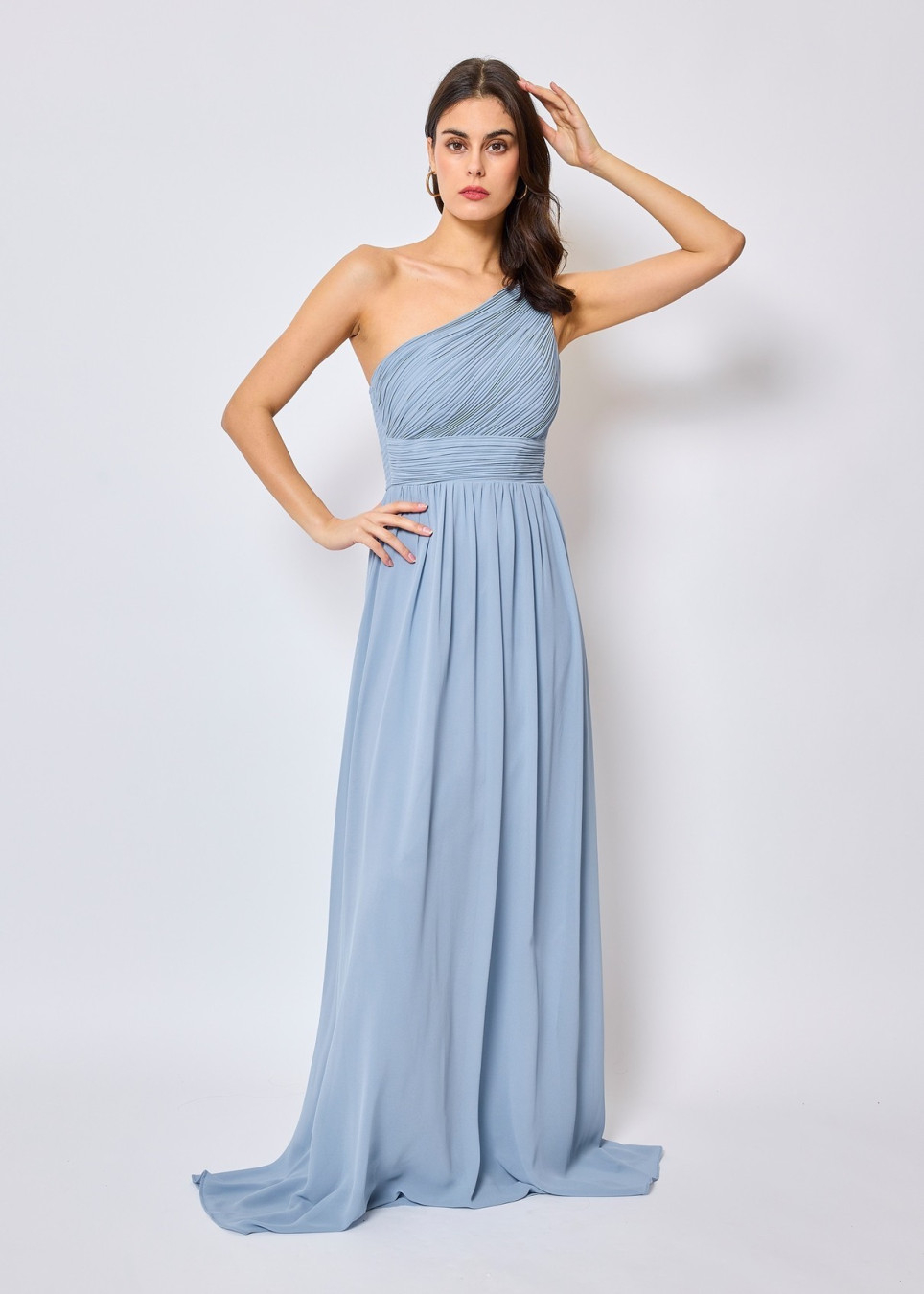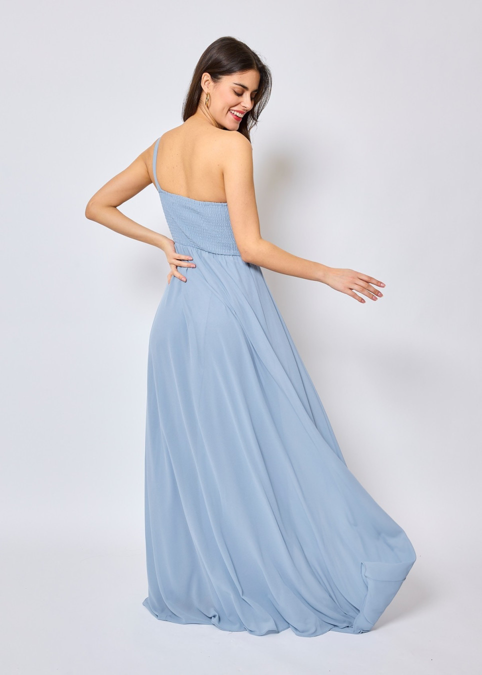 O vestido apresentado é um modelo longo e elegante na cor azul. Ele possui um design assimétrico com um ombro só, trazendo um toque moderno e sofisticado. A parte superior apresenta um drapeado delicado, valorizando o busto, enquanto a cintura é bem marcada para realçar a silhueta.
