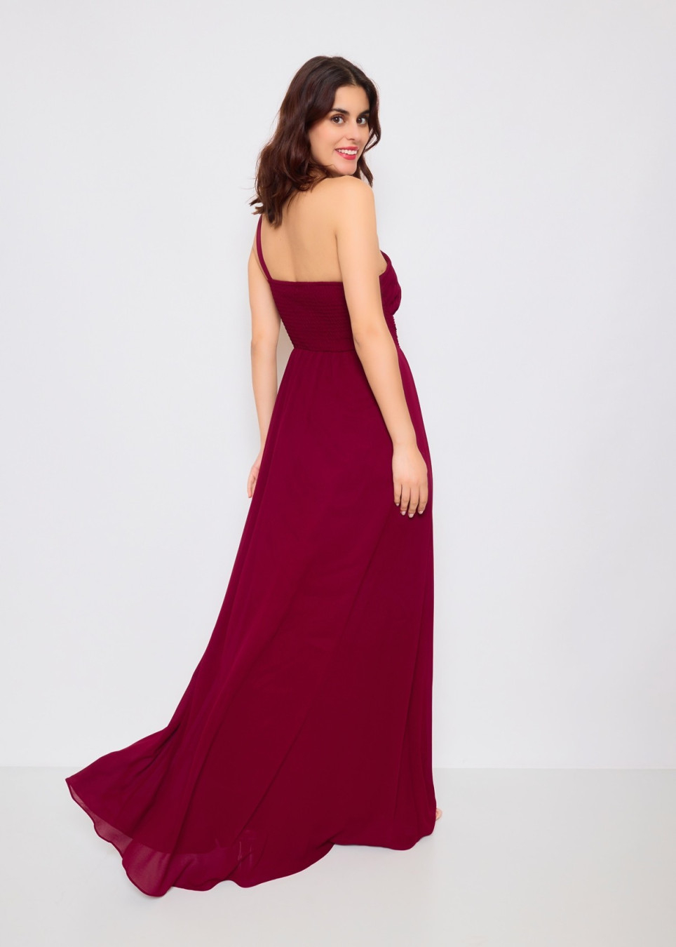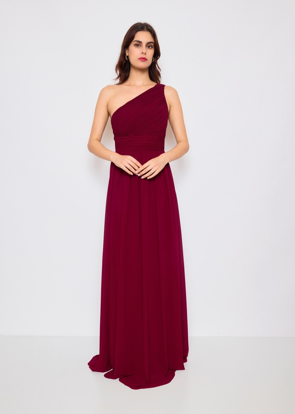 O vestido apresentado é um modelo longo e elegante na cor bordô. Ele possui um design assimétrico com um ombro só, trazendo um toque moderno e sofisticado. A parte superior apresenta um drapeado delicado, valorizando o busto, enquanto a cintura é bem marcada para realçar a silhueta.