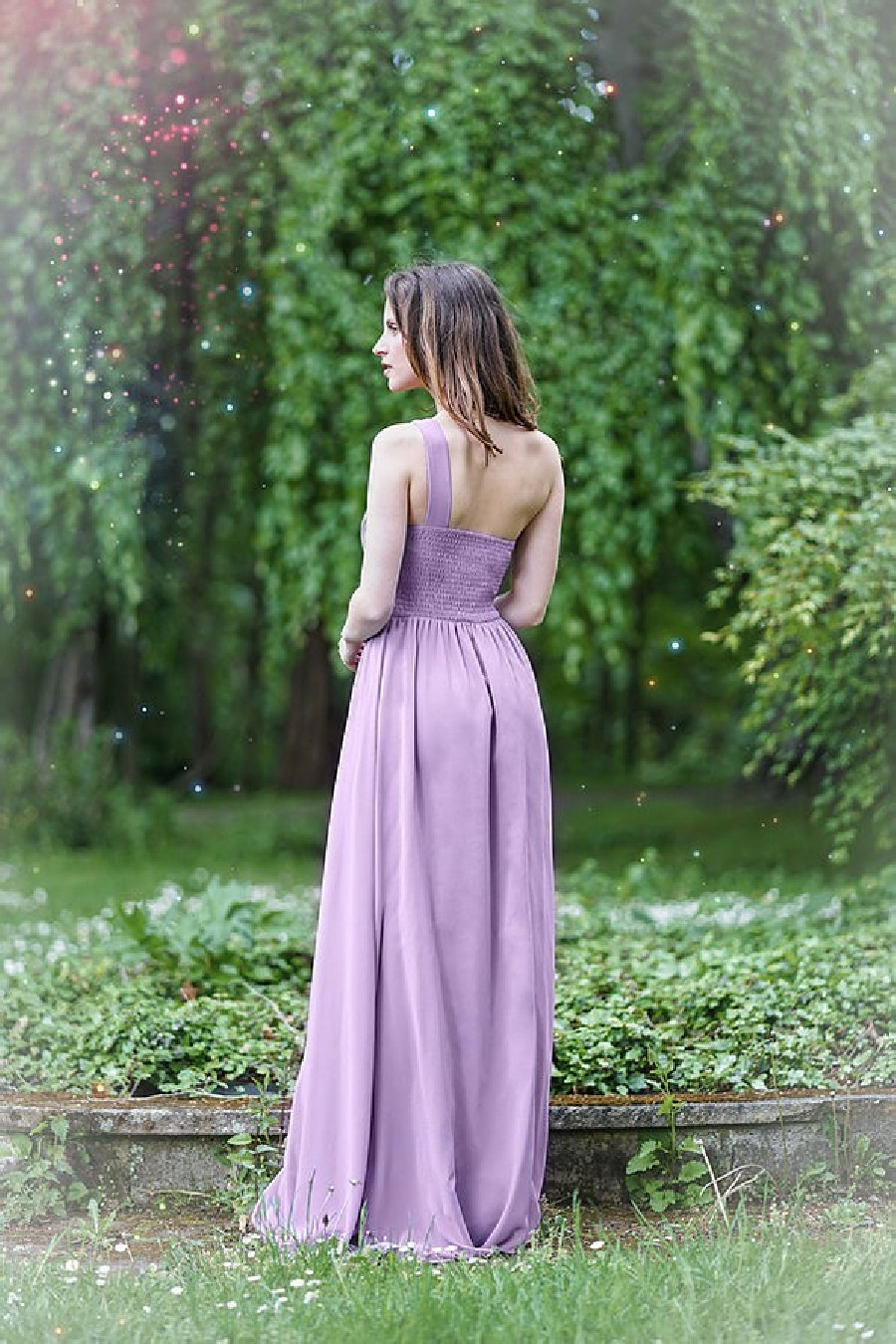 O vestido apresentado é um modelo longo e elegante na cor lavanda. Ele possui um design assimétrico com um ombro só, trazendo um toque moderno e sofisticado. A parte superior apresenta um drapeado delicado, valorizando o busto, enquanto a cintura é bem marcada para realçar a silhueta.