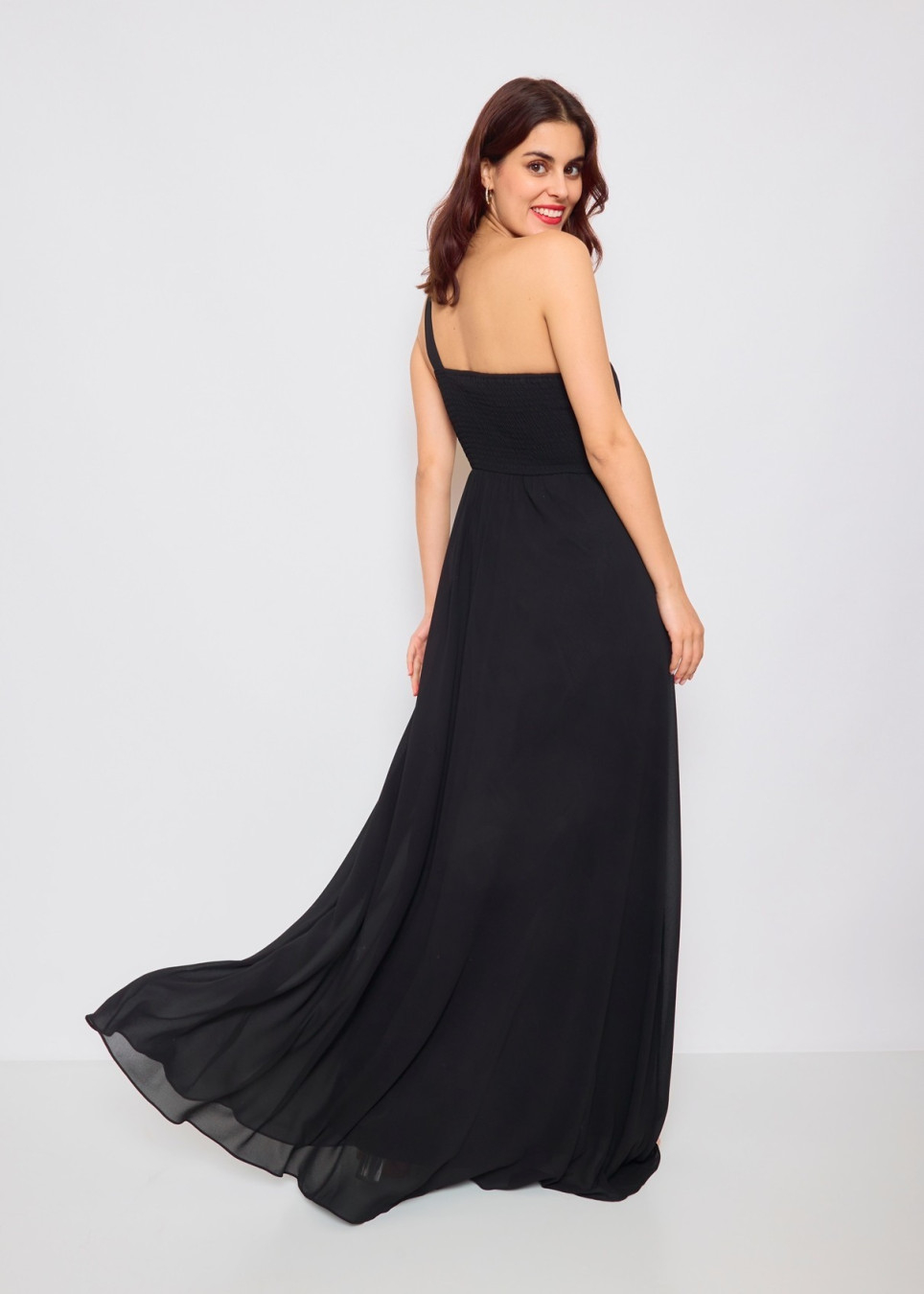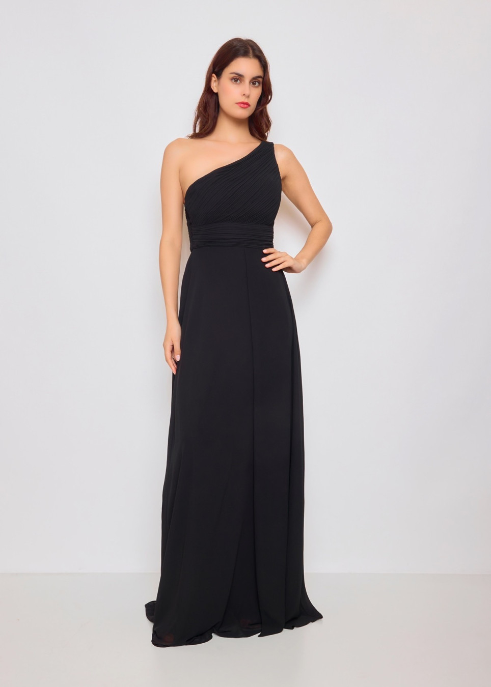 O vestido apresentado é um modelo longo e elegante na cor azulão. Ele possui um design assimétrico com um ombro só, trazendo um toque moderno e sofisticado. A parte superior apresenta um drapeado delicado, valorizando o busto, enquanto a cintura é bem marcada para realçar a silhueta.