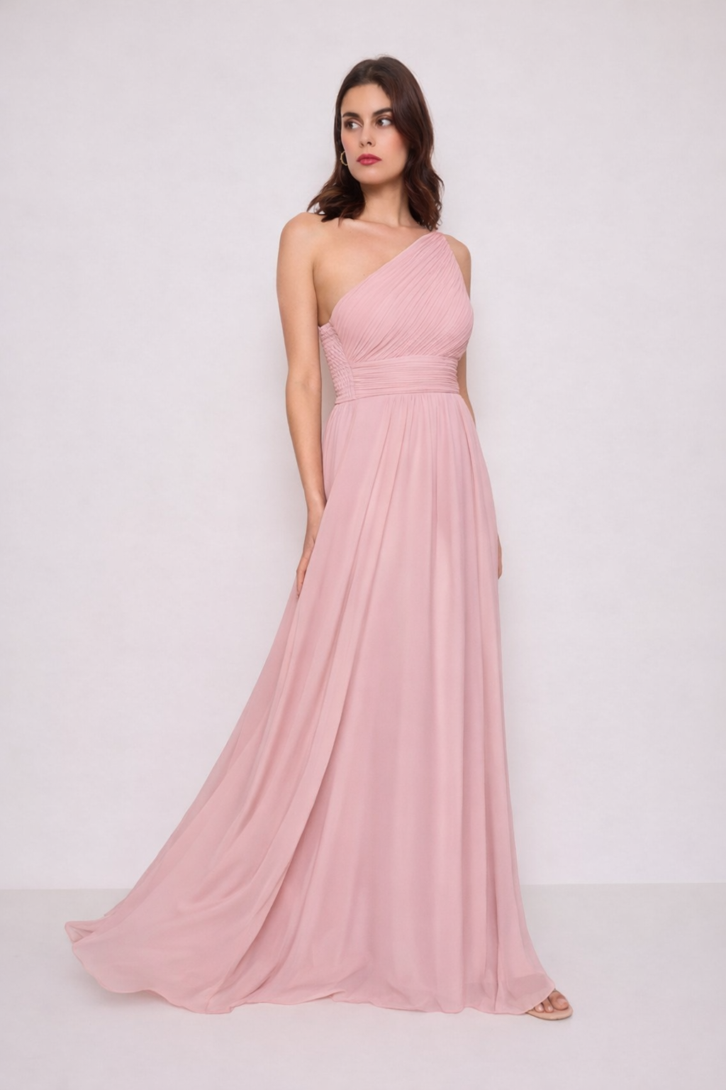 O vestido apresentado é um modelo longo e elegante na cor rosa. Ele possui um design assimétrico com um ombro só, trazendo um toque moderno e sofisticado. A parte superior apresenta um drapeado delicado, valorizando o busto, enquanto a cintura é bem marcada para realçar a silhueta.