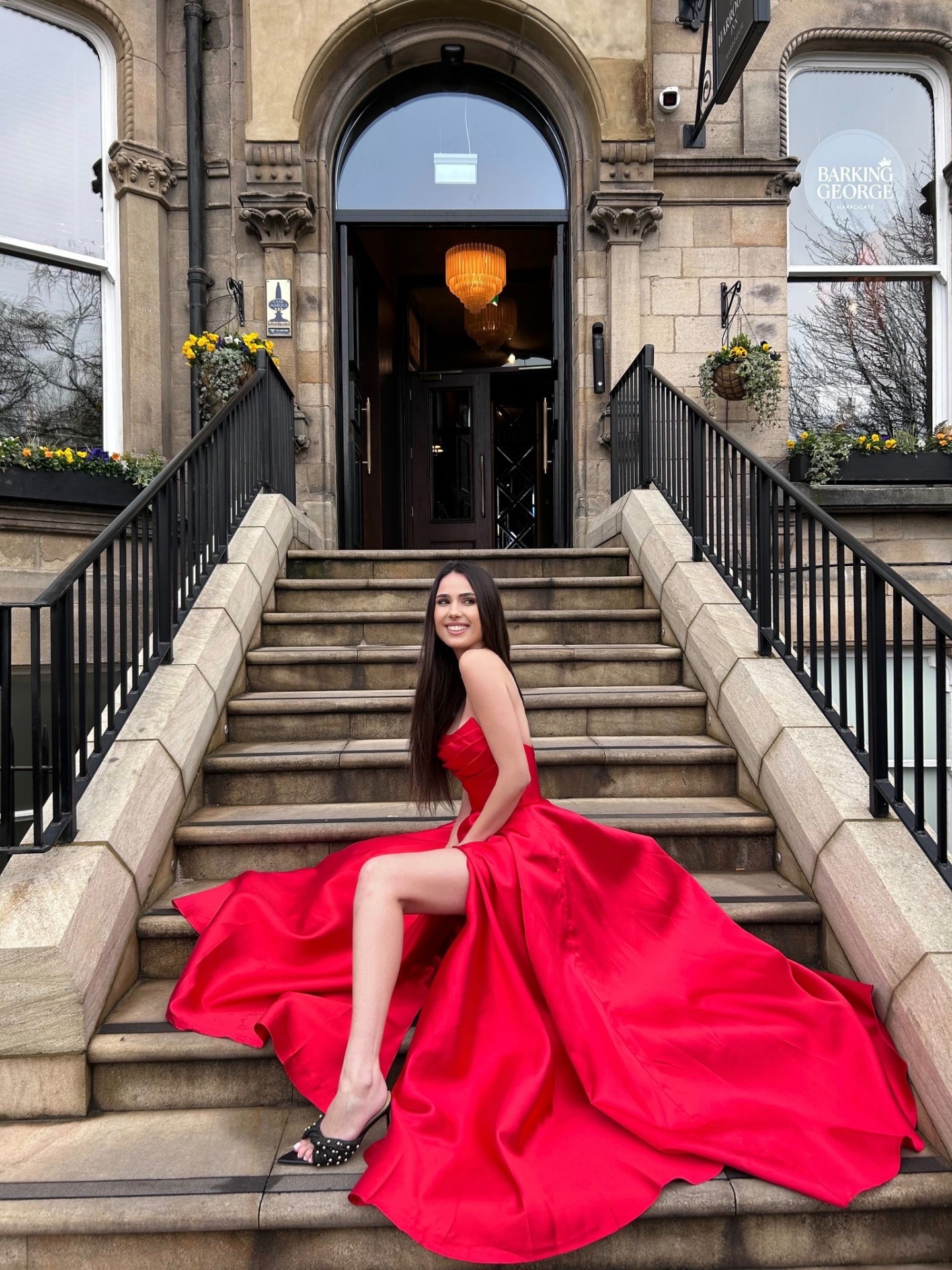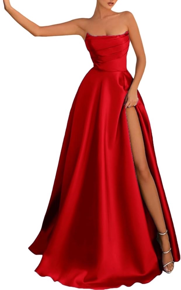 A saia ampla e fluida confere movimento e imponência ao modelo, enquanto a fenda lateral alta adiciona um elemento de sensualidade e modernidade, equilibrando o estilo clássico com um toque ousado. A cor vermelho realça a sofisticação da peça, tornando-a uma escolha perfeita para eventos formais.