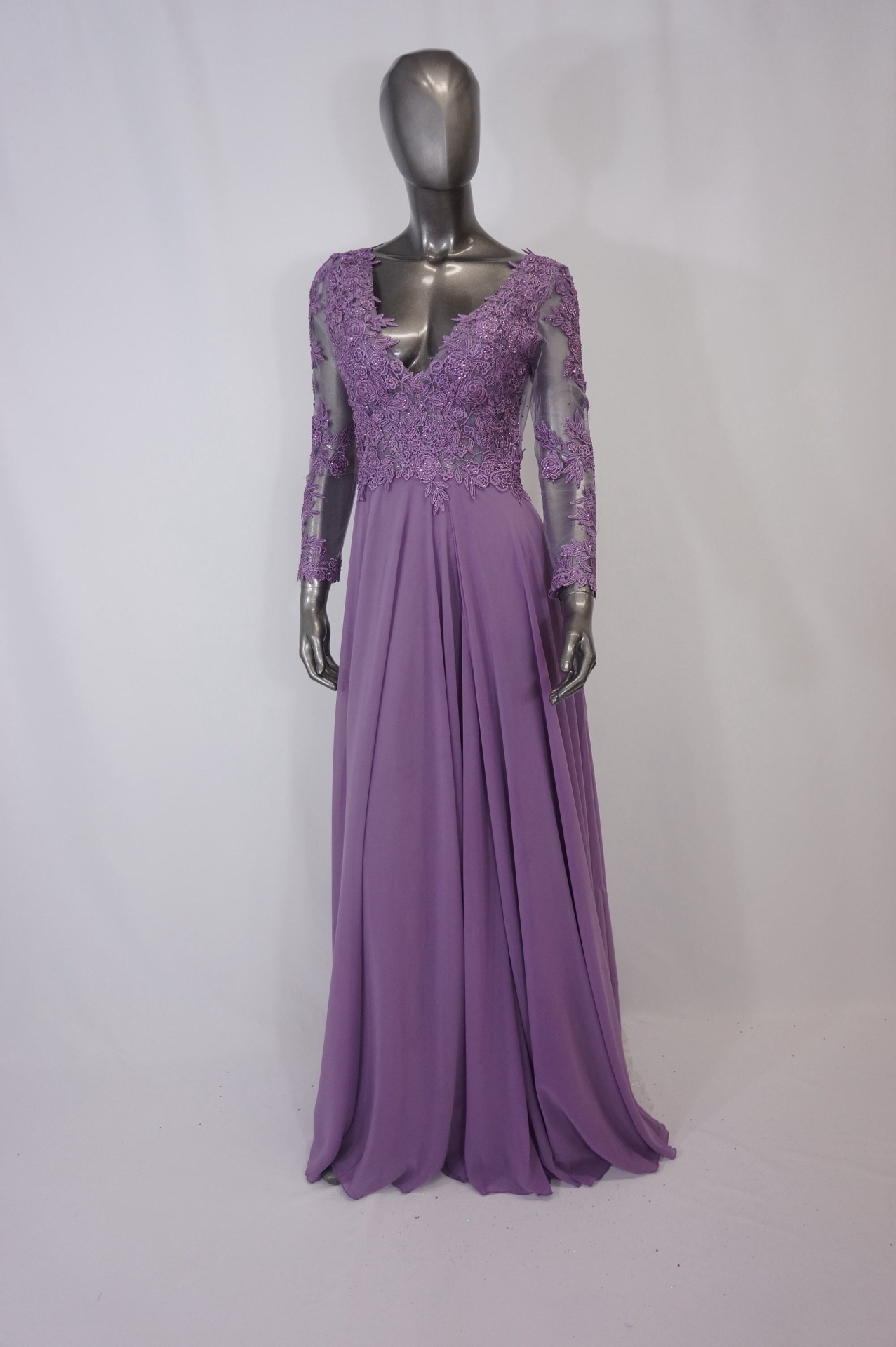Este vestido é deslumbrante e elegante. Trata-se de um modelo de gala em tom lavanda, longo e fluído, com um caimento leve e sofisticado. O corpete apresenta um decote em V profundo e mangas compridas de tule transparente, adornadas com aplicações rendadas e bordados que conferem um toque refinado e romântico. A saia ampla e esvoaçante complementa a silhueta, criando um efeito de movimento gracioso. O conjunto transmite sofisticação e classe, ideal para eventos formais e ocasiões especiais.