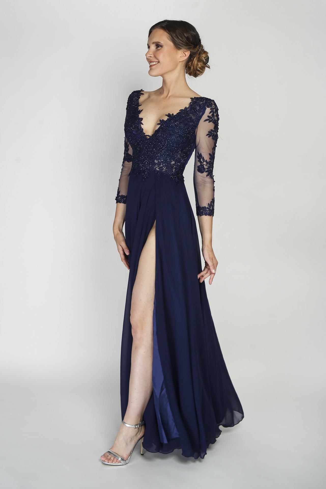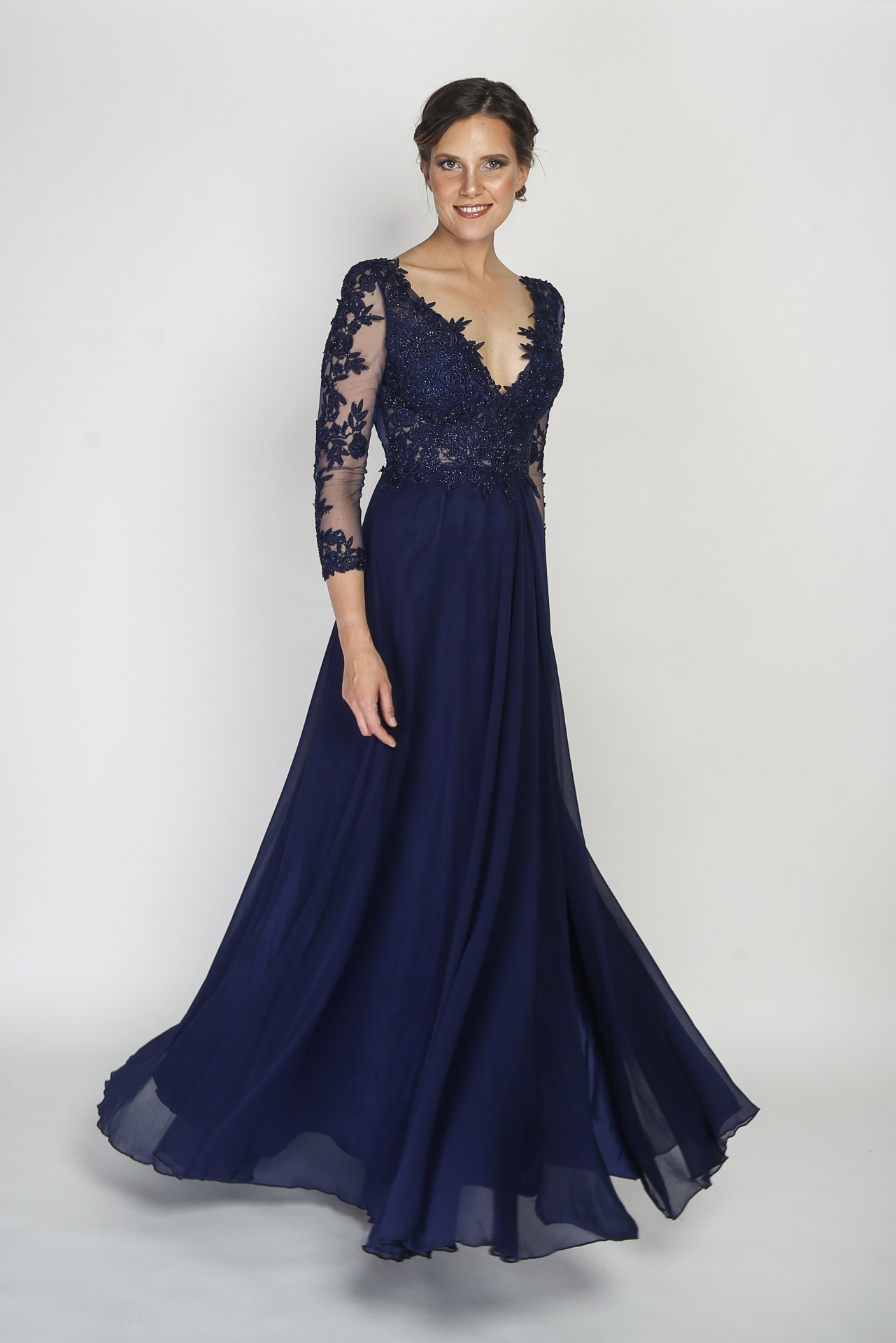 Este vestido é deslumbrante e elegante. Trata-se de um modelo de gala em tom azul, longo e fluído, com um caimento leve e sofisticado. O corpete apresenta um decote em V profundo e mangas compridas de tule transparente, adornadas com aplicações rendadas e bordados que conferem um toque refinado e romântico. A saia ampla e esvoaçante complementa a silhueta, criando um efeito de movimento gracioso. O conjunto transmite sofisticação e classe, ideal para eventos formais e ocasiões especiais.