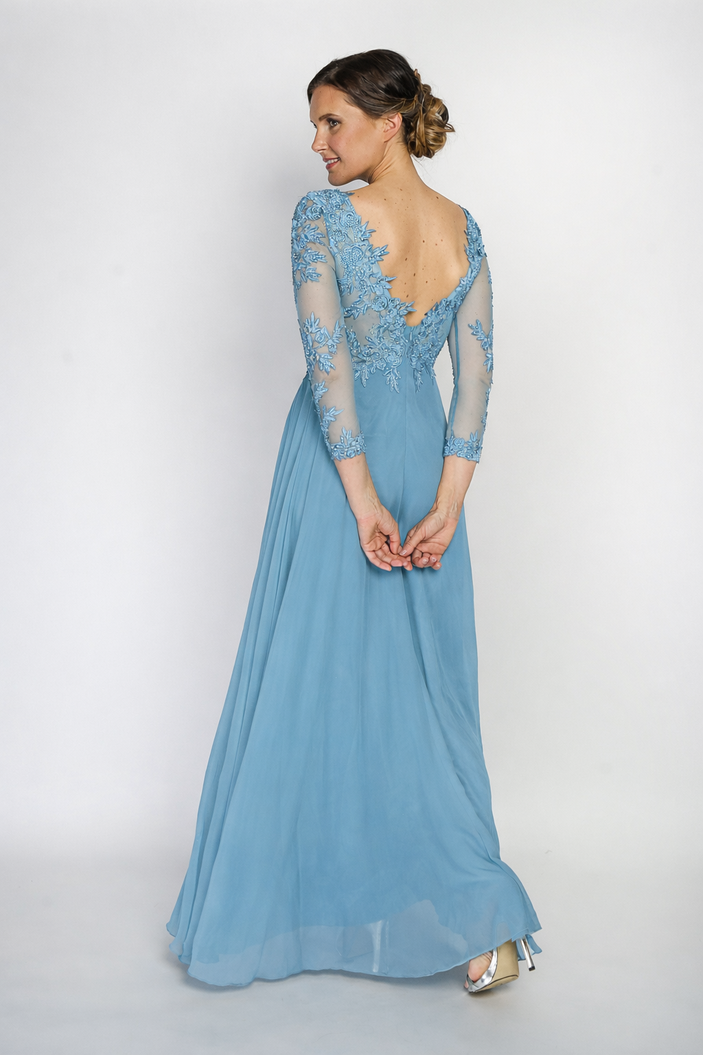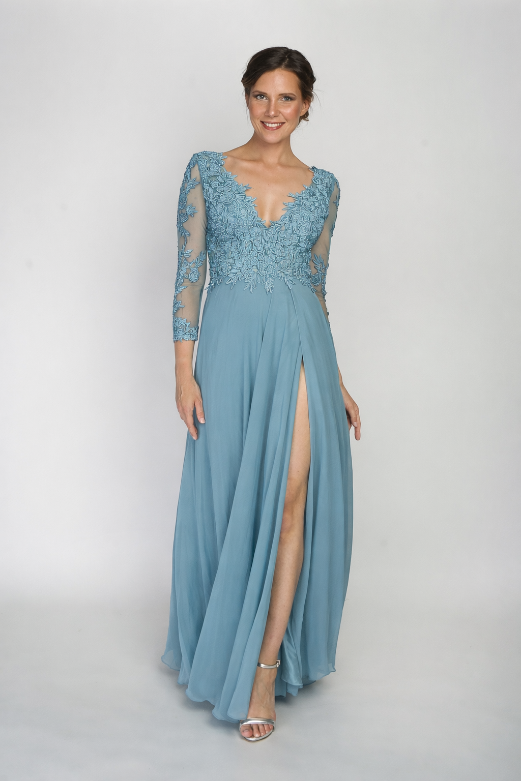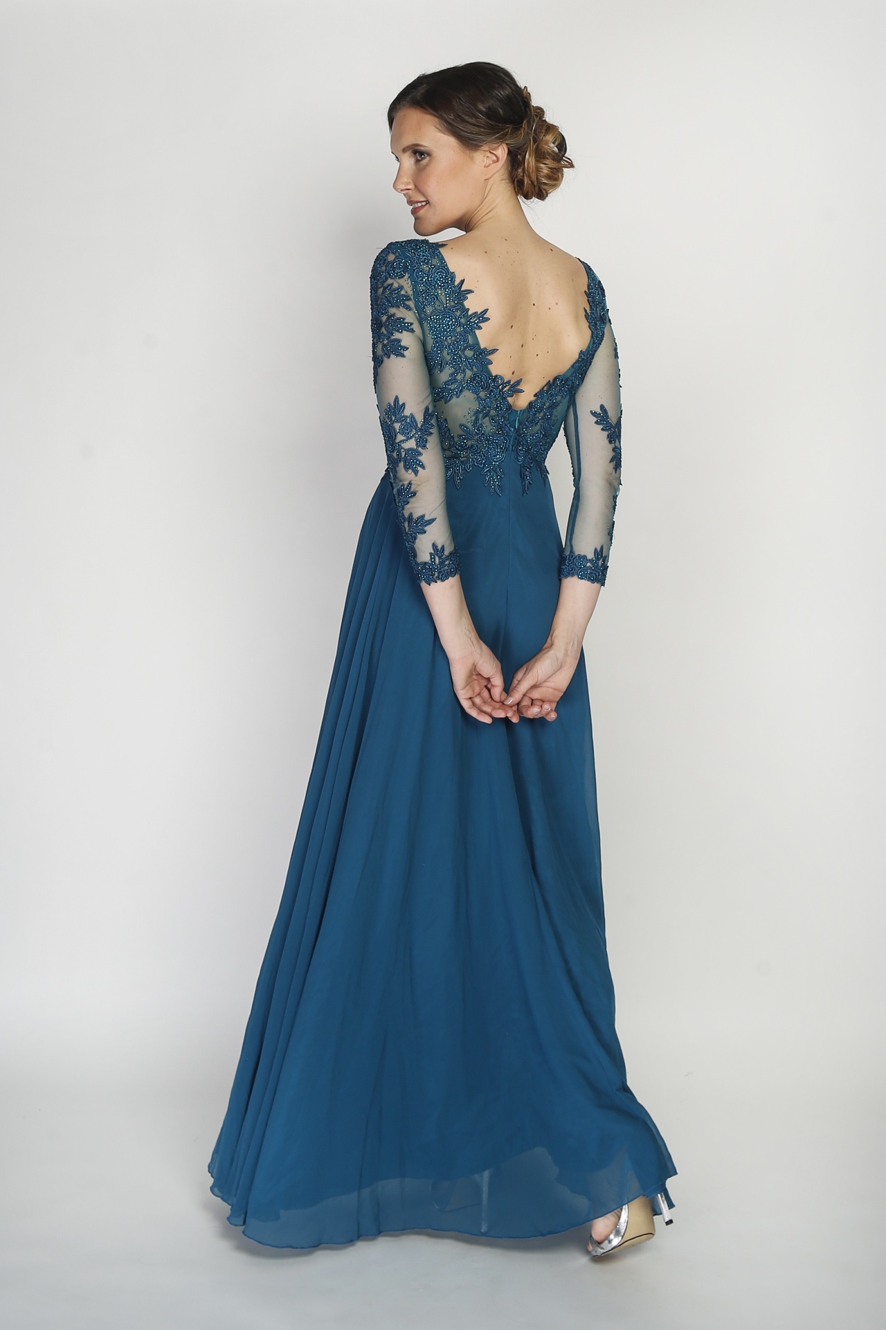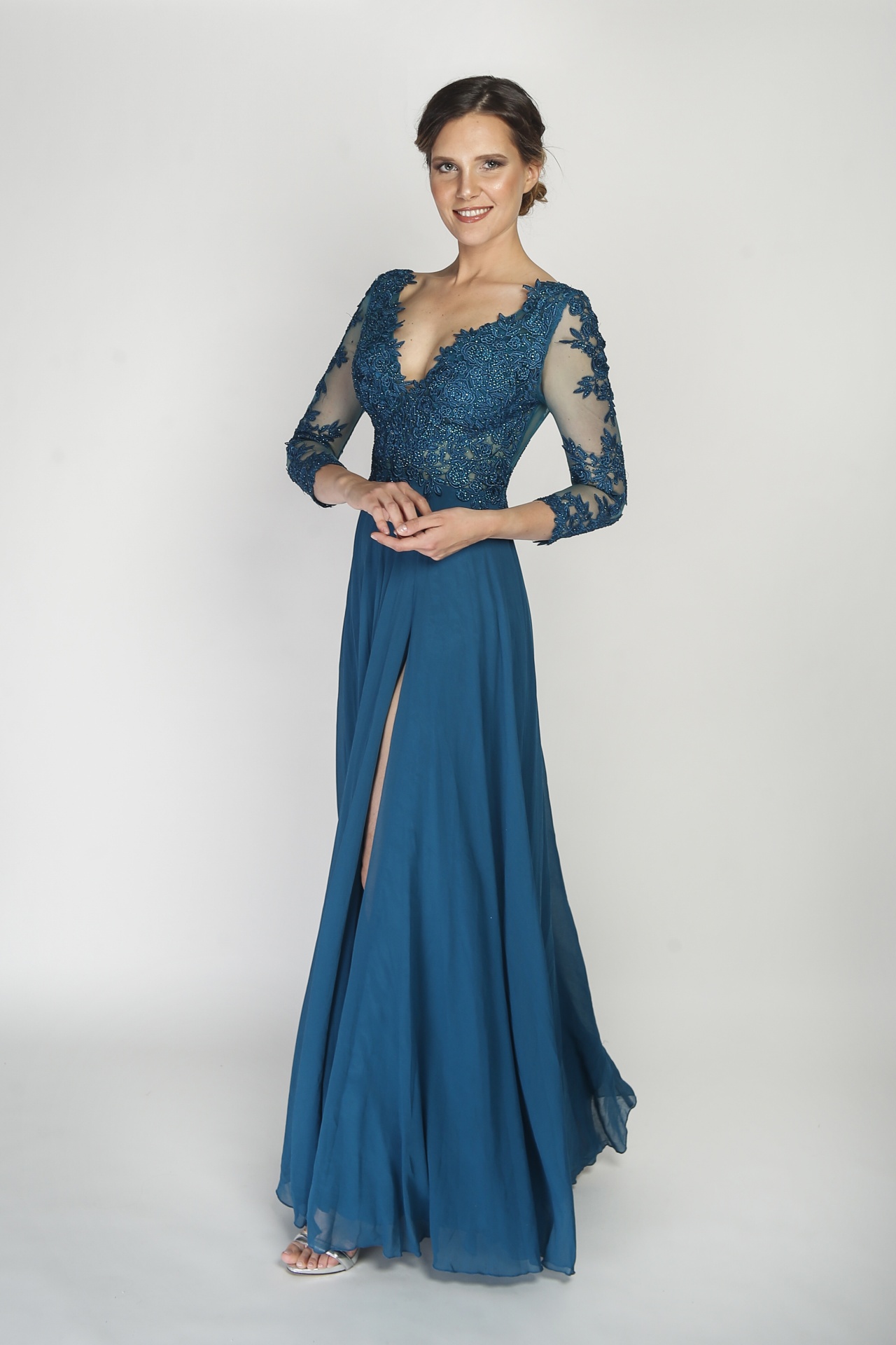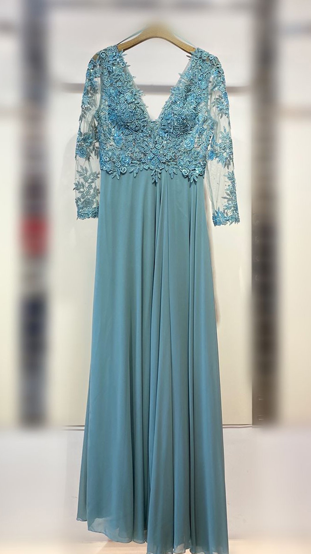 Este vestido é deslumbrante e elegante. Trata-se de um modelo de gala em tom verde, longo e fluído, com um caimento leve e sofisticado. O corpete apresenta um decote em V profundo e mangas compridas de tule transparente, adornadas com aplicações rendadas e bordados que conferem um toque refinado e romântico. A saia ampla e esvoaçante complementa a silhueta, criando um efeito de movimento gracioso. O conjunto transmite sofisticação e classe, ideal para eventos formais e ocasiões especiais.